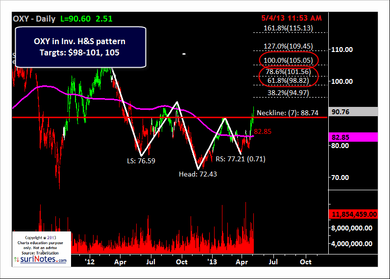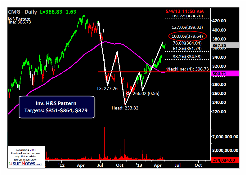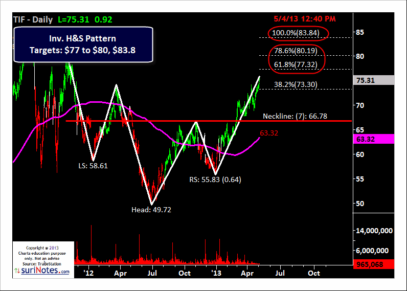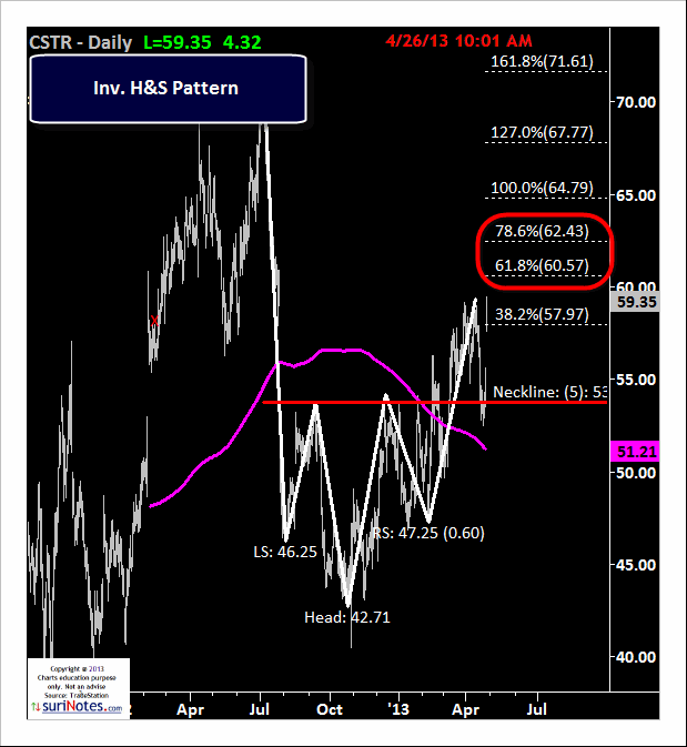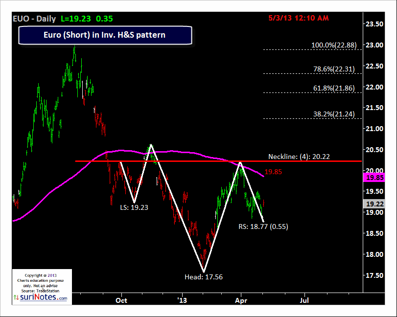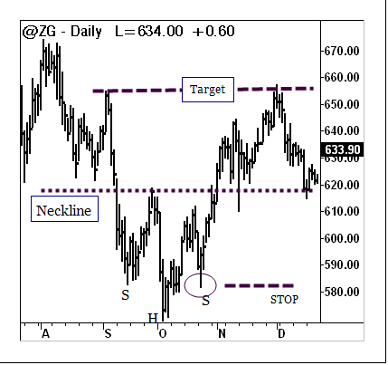 Inverse Head and Shoulders patterns are mirror images of Head and Shoulders patterns. They are formed with inverse shoulder (like valley), another larger valley (head part) and followed by another valley (second shoulder). A neckline is drawn connecting three top parts of the valleys using a trend line. This neckline is used as a way to signal or trigger a trade and measure targets. Inverse Head and Shoulders pattern is very reliable pattern. They are more effective when patterns are formed at the end of down-trend.